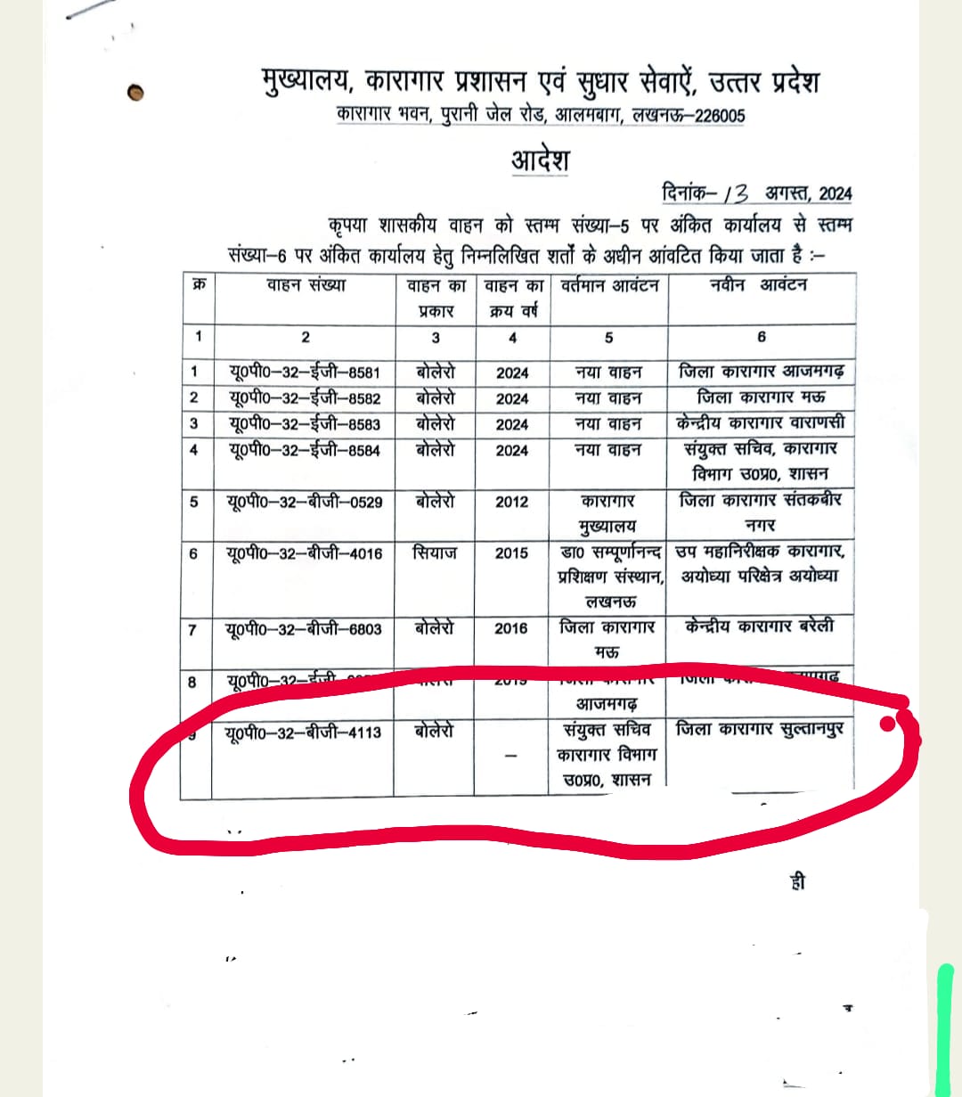 इसके अलावा 2012 में खरीदी गई बोलरो मुख्यालय से संत कबीर नगर को, 2016 की मऊ की बोलेरो केंद्रीय कारागार बरेली को, 2019 में आजमगढ़ को दी गई बोलेरो प्रतापगढ़ को दी गई है। बगैर क्रय वर्ष का हवाला दिए संयुक्त सचिव के यहां लगी बोलेरो को सुलतानपुर जेल अधीक्षक को आवंटित किया गया है।