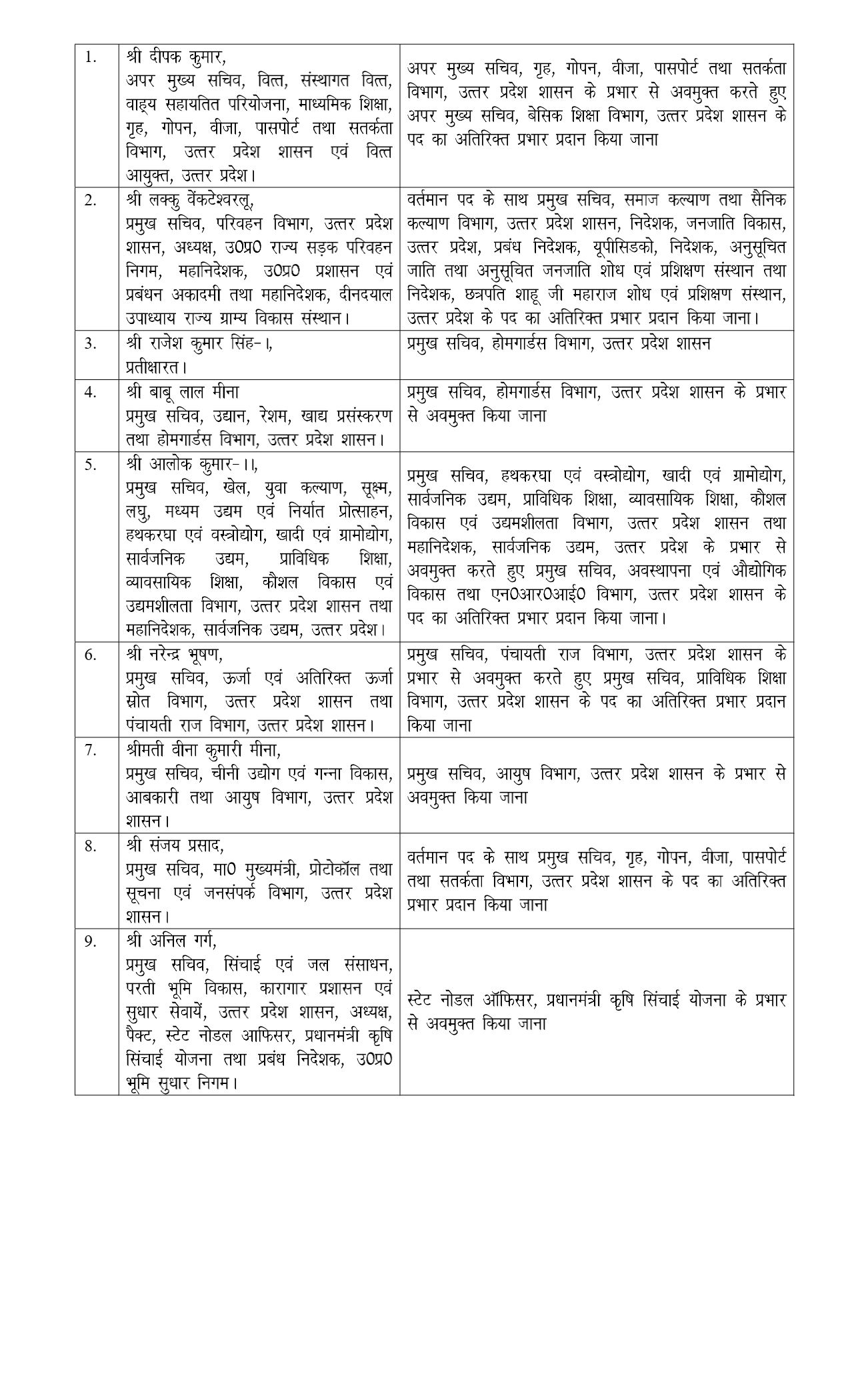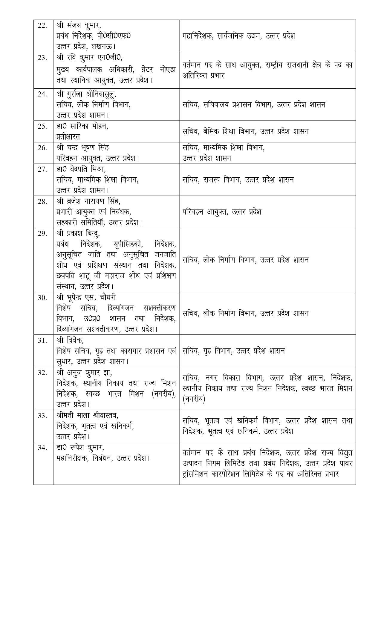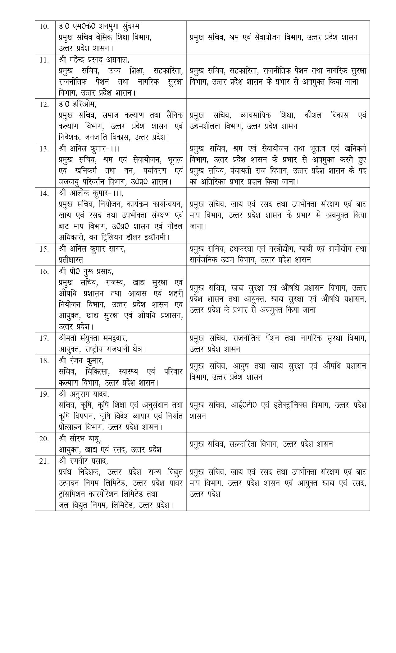 प्रमुख सचिव बेसिक शिक्षा का पद सँभाल रहे एमकेएस सुंदरम् को प्रमुख सचिव श्रम एवं सेवायोजन के पद पर भेजा गया है। उनकी जगह अपर मुख्य सचिव वित्त दीपक कुमार अब बेसिक शिक्षा सँभालेंगे। साल 1997 बैच के आईएएस अफ़सर एमपी अग्रवाल से प्रमुख सचिव सहकारिता, राजनीतिक पेंशन तथा नागरिक सुरक्षा का प्रभार वापस लिया गया है। उनकी जगह सचिव से प्रमुख सचिव बने 2000 बैच के टॉपर सौरभ बाबू को प्रमुख सचिव सहकारिता का प्रभार सौंपा गया। अभी तक वो खाद्य आयुक्त की भूमिका निभा रहे थे। इस बार धान ख़रीद में किसी तरह की अव्यवस्था न आने के कारण सरकार ने उन्हें एक बड़ा विभाग सौंपा। वहीं प्रमुख सचिव राजनीतिक पेंशन तथा नागरिक सुरक्षा की अतिरिक्त ज़िम्मेदारी 1999 बैच की अधिकारी संयुक्ता समद्दर को सौंपी गई। इसके पहले संयुक्ता आयुक्त राष्ट्रीय राजधानी क्षेत्र की भूमिका निभा रही थीं।