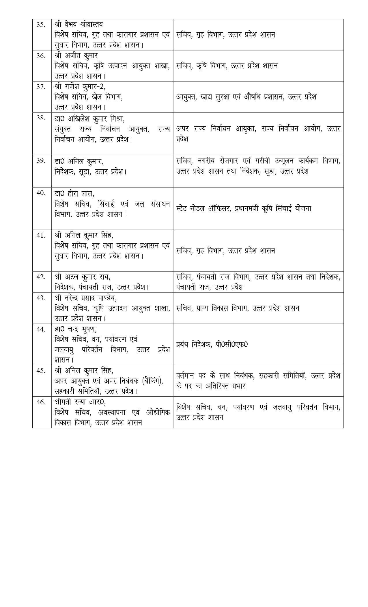साल 2000 बैच के अफ़सर अनुराग यादव को सचिव कृषि से प्रमुख सचिव आईटी एवं इलेक्ट्रानिक्स की ज़िम्मेदारी सौंपी गई। इसके पहले यह विभाग अनिल सागर के पास था। जबकि इसी बैच के रणवीर प्रसाद को प्रबंध निदेशक राज्य विद्युत उत्पादन निगम लि. एवं उत्तर प्रदेश पॉवर ट्रांसमिशन कॉरपोरेशन लि. तथा जल विद्युत निगम से हटाकर प्रमुख सचिव खाद्य एवं रसद एवं बाट माप विभाग की ज़िम्मेदारी दी गई। इसके अलावा साल 2009 बैच के अफ़सरों को भी नई ज़िम्मेदारी मिली है। हालाँकि अधिकांश को उसी विभाग में विशेष सचिव से सचिव बना दिया गया। जिसमें वैभव श्रीवास्तव, अनुज झा, अटल राय एवं डॉ. अनिल कुमार सिंह का नाम शामिल है।