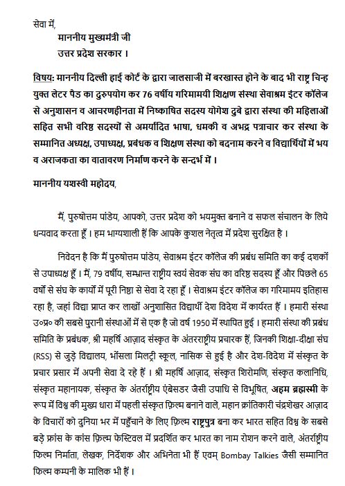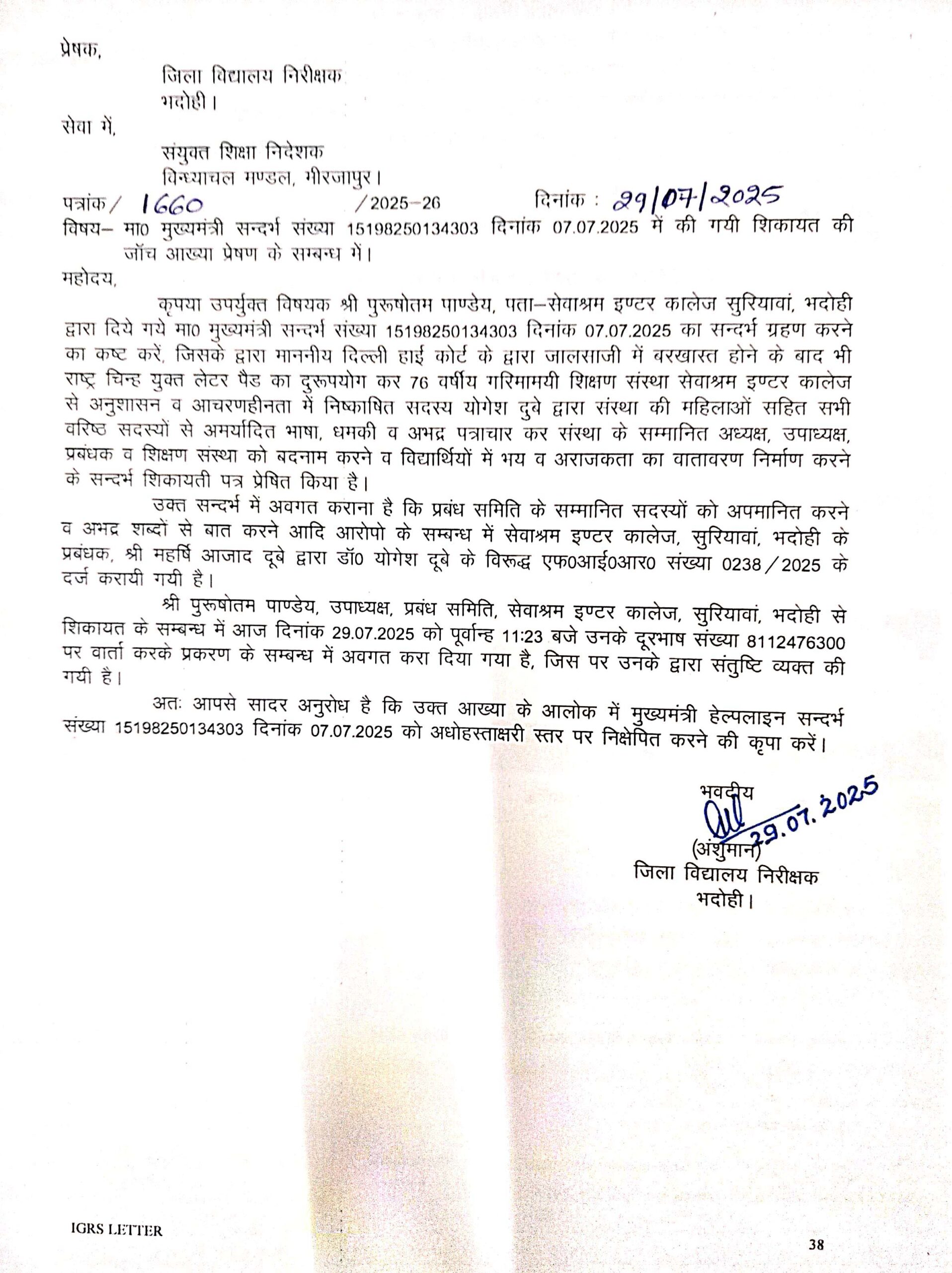अपने पिता के शिक्षण संस्थान से निष्कासित होने के बाद योगेश दूबे विद्यालय में कार्यरत शिक्षकों को भद्दे-भद्दे अपशब्दों से नवाजता रहता है, जिसकी शिकायत सुरियावां थाने में सेवाश्रम इंटर कॉलेज के उपाध्यक्ष पुरुषोत्तम पांडेय ने थानाध्यक्ष सुरियावां से की थी। वहां से न्याय न मिलने की दशा में उन्होंने मुख्यमंत्री से गुहार लगाई। सीएम के आदेश पर जिला विद्यालय निरीक्षक (डीआईओएस) अंशुमान ने साफ-साफ आदेशित किया कि अनुशासन व आचरणहीनता के चलते सेवाश्रम इंटर कॉलेज के पदाधिकारियों को वह शख्स धमकाता है, जो खुद तकरीबन 13 साल पहले अपने पद से बर्खास्त हो चुका है। बकौल डीआईओएस योगेश दुबे राष्ट्रचिन्ह लगे लेटरपैड का दुरुपयोग निजी हित के लिए करता है और अधिकारियों को उसी के दम पर धौंस दिखाता रहता है।