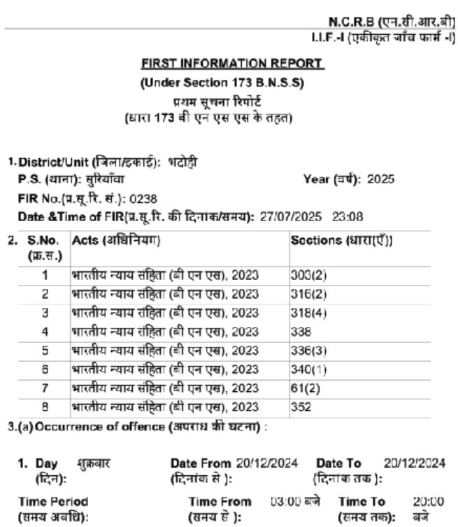 - भदोही जिले की घटनाः जानकारी मिलने पर स्थानीय पुलिस बनी रही मूकदर्शक