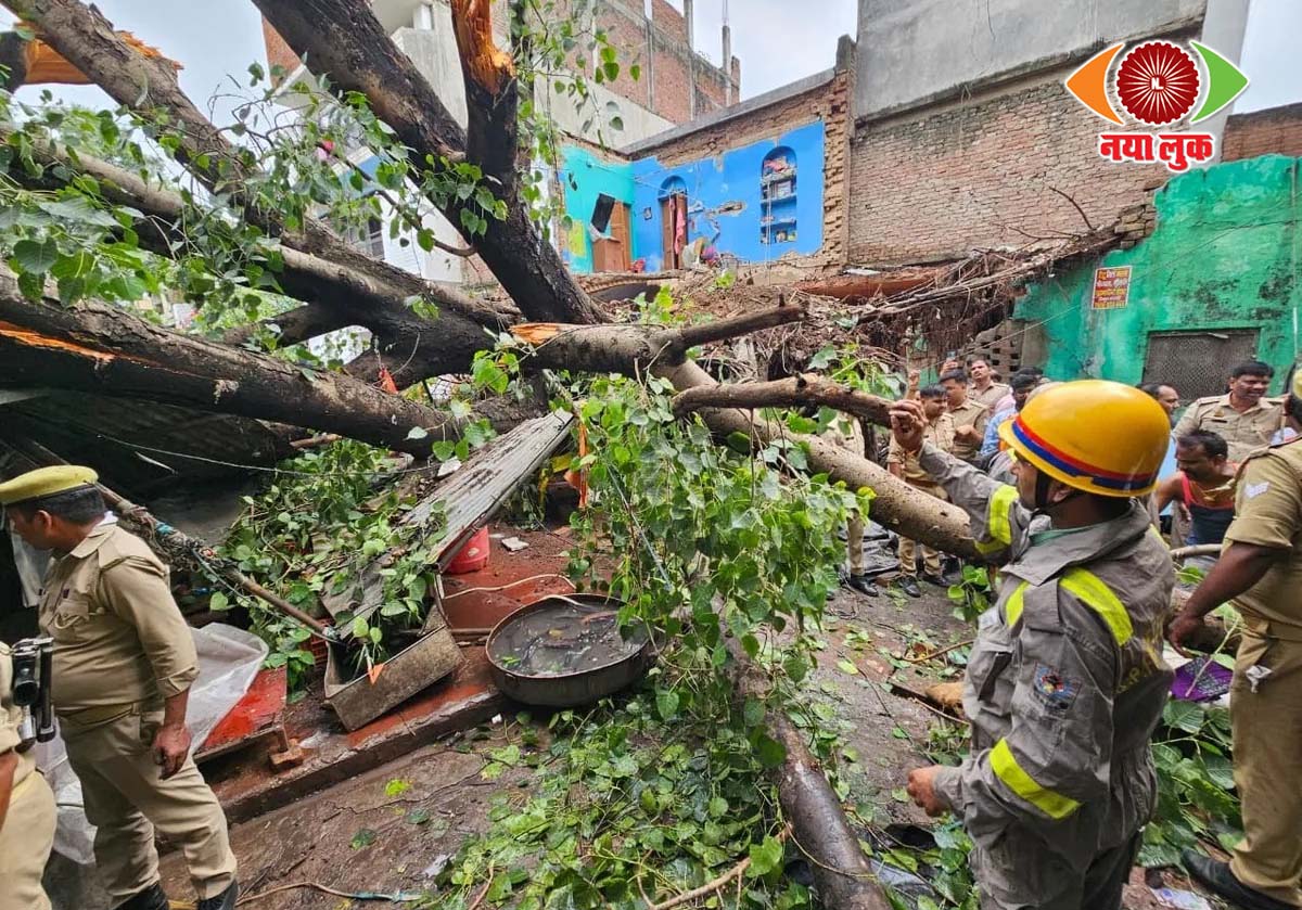 कैसरबाग: मूसलाधार बारिश के चलते रिहायशी इलाके में सौ साल पुराना पेड़ गिरा