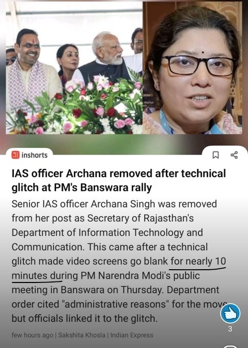 जयपुर। प्रधानमंत्री की जनसभा के दौरान क्या टेलीप्रॉम्प्टर मौन हो सकता है, सुनने में यह बात भले ही अटपटी लग रही हो पर राजस्थान के बांसवाड़ा में पिछले दिनो सत्ता शीर्ष को असहज करने वाला कुछ ऐसा ही नजारा देखने को मिला। बांसवाड़ा के नापला गांव में प्रधानमंत्री की जनसभा के दौरान ही टेलीप्रॉम्प्टर खामोश हो गया और वीडियो स्क्रीन करीब 10 मिनट तक ब्लैंक हो गईं। दस मिनट के इस तकनीकी ब्लैकआउट की गाज राजस्थान की नौकरशाही पर गिरी । घटना से तुरंत बाद राज्य सरकार ने वरिष्ठ आईएएस अर्चना सिंह को आनन-फानन आईटी एवं संचार विभाग के सचिव पद से हटाते हुए उन्हें APO ( Awaiting Posting Order) पर डाल दिया गया है। विपक्ष ने इस मुद्दे पर सरकार और प्रधानंत्री को जोरदार तरीके से घेरा।