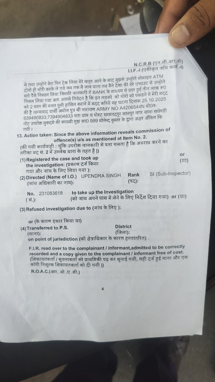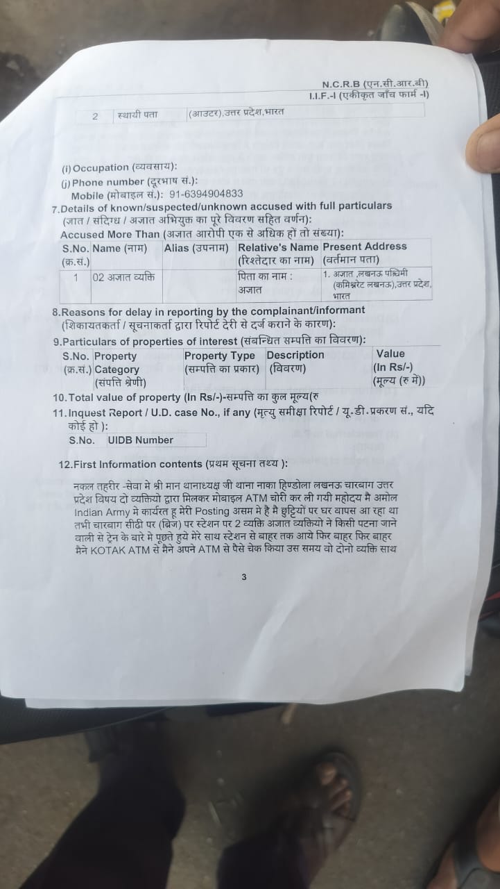 कानपुर नगर जिले के सचैडी थाना क्षेत्र स्थित मंगदपुर निवासी अमोल पुत्र नारायण असम राज्य की सीमा पर इंडियन आर्मी में तैनात हैं। सोशल मीडिया पर वायरल हुई वीडियो में उन्होंने बताया कि वह छुट्टी लेकर ट्रेन के जरिए वापस घर लौट रहे थे कि जैसे ही चारबाग रेलवे स्टेशन पर उतरे तो उनसे दो अनजान व्यक्ति पटना जाने वाली ट्रेन के बारे में पूछा। अमोल यह कहते हुए आगे बढ़े कि अनजान व्यक्ति भी उनके साथ हो लिए और दोस्ती का हाथ बढ़ाते हुए पूरी तरह से झांसे में लेने के बाद दोनों अनजान व्यक्तियों ने उनका मोबाइल फोन व ATM कार्ड लेकर भाग निकले। अमोल को उस समय एहसास हुआ जब उसके बैंक खाते से दो लाख 80 हजार रुपए निकल गए।