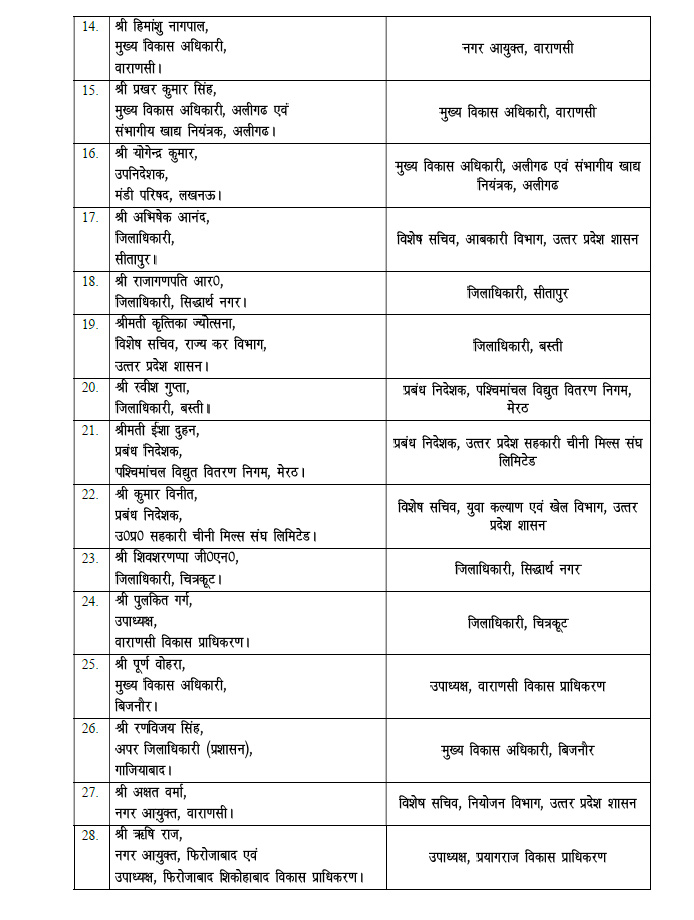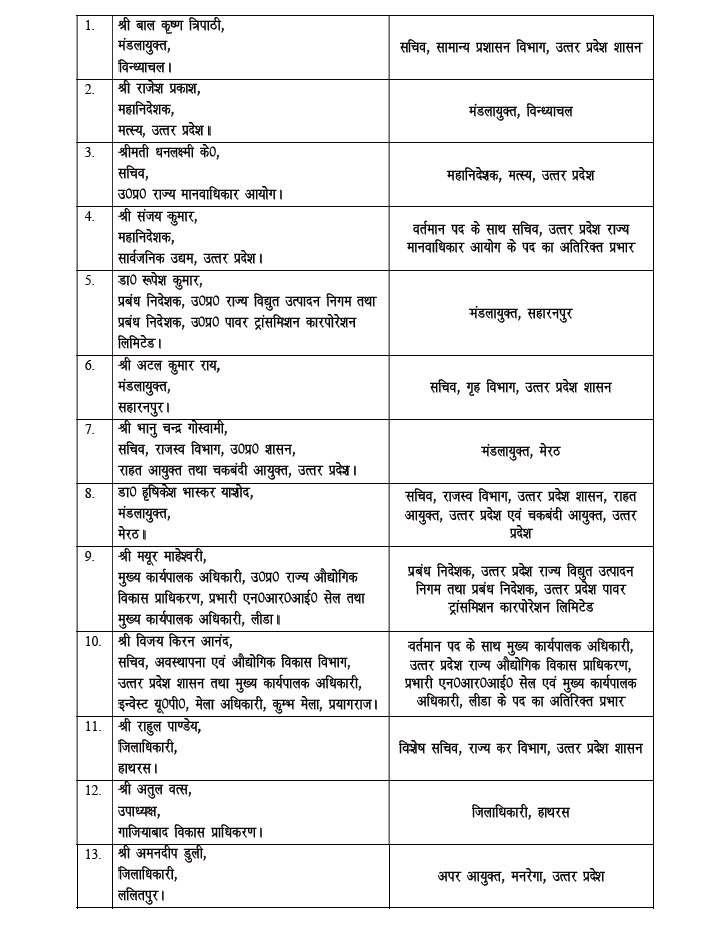 वहीं मेरठ के नए मंडलायुक्त के पद पर 2009 बैच के भानुचंद्र गोस्वामी को भेजा गया है। साथ ही मत्स्य विभाग के DG राजेश प्रकाश को सहारनपुर के कमिश्नर की जिम्मेदारी सौंपी गई है। बताते चले कि मीरजापुर के कमिश्नर बालकृष्ण त्रिपाठी अगले महीने रिटायर हो रहे हैं। वहीं सहारनपुर के कमिश्नर अटल राय को गृह विभाग में भेज दिया गया। जबकि मेरठ के मंडलायुक्त हृषिकेश भास्कर यशोद को नया राहत आयुक्त बनाया गया है। इस सूची में DM बस्ती रवीश गुप्ता भी शामिल हैं। इन्हें पश्चिमांचल विद्युत वितरण निगम का प्रबंध निदेशक बनाया गया है।