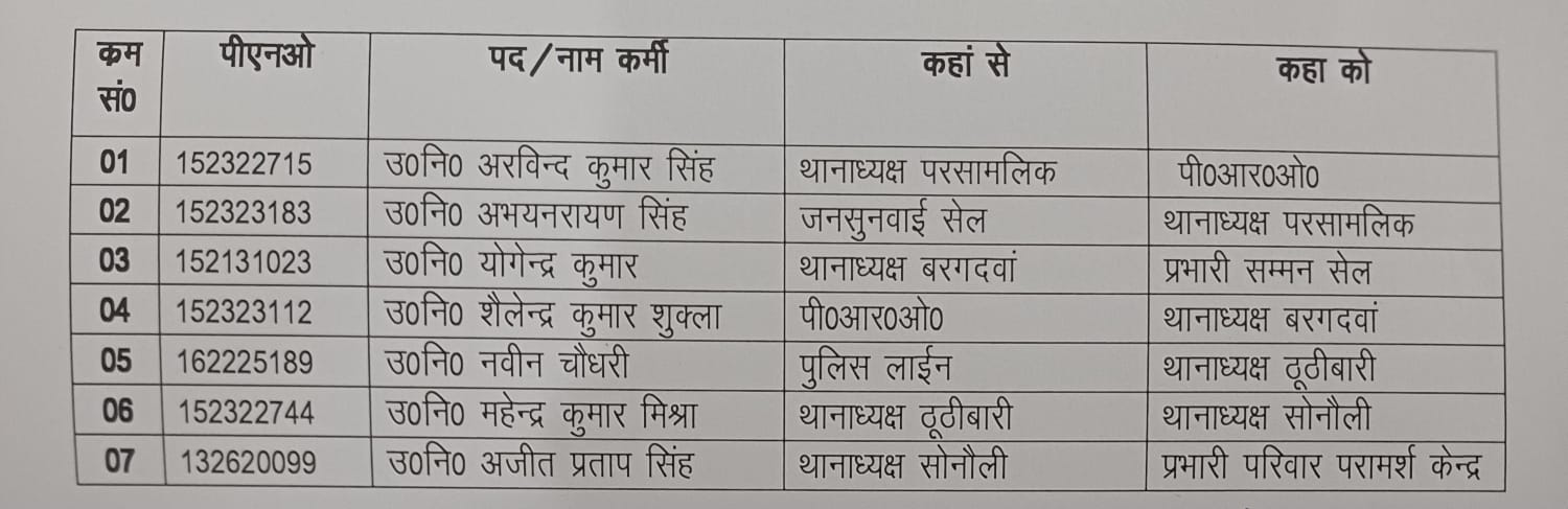 कार्रवाई के तहत परसामलिक, बरगदवां और ठूठीबारी थाना क्षेत्रों से जुड़े थानेदारों की थानेदारी छीन ली गई। वहीं कुछ उपनिरीक्षकों को पीआरओ, पुलिस लाइन, जनसुनवाई सेल और अन्य शाखाओं में भेजा गया है, जबकि नए अधिकारियों को सीमावर्ती थानों की जिम्मेदारी सौंपी गई है। माना जा रहा है कि नए प्रभारियों को स्पष्ट निर्देश दिए गए हैं कि सीमा पर तस्करी किसी भी हाल में बर्दाश्त नहीं की जाएगी। बदले गए उपनिरीक्षकों में उ0नि0 अरविन्द कुमार सिंह, अभय नारायण सिंह, योगेन्द्र कुमार, शैलेन्द्र कुमार शुक्ला, नवीन चौधरी, महेन्द्र कुमार मिश्रा और अजीत प्रताप सिंह शामिल हैं। इन सभी के दायित्वों में बदलाव कर प्रशासन ने साफ संकेत दिया है कि अब कामकाज की नियमित मॉनिटरिंग की जाएगी।