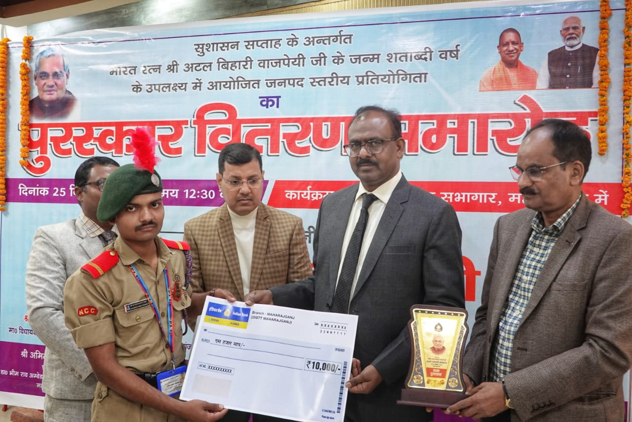 जिलाधिकारी महोदय ने उपस्थित विद्यार्थियों को उनके जीवन से प्रेरणा लेने की सलाह देते हुए कहा कि संघर्ष व्यक्ति को बेहतर बनाता है। इसलिए अगर जीवन में सफल होना है तो परिश्रम और संघर्ष के लिए तैयार रहिए। भारत रत्न पूर्व प्रधानमंत्री अटल बिहारी वाजपेई के जन्म शताब्दी के अवसर पर निबंध प्रतियोगिता में विजेता विशाल जायसवाल को पांच हजार का डेमो चेक, प्रशस्ति पत्र व स्मृति चिन्ह, द्वितीय स्थान प्राप्त अमर नाथ यादव को तीन हजार, प्रशस्ति पत्र व स्मृति चिन्ह, तथा तृतीय स्थान पर जागृति त्रिपाठी को दो हजार प्रशस्ति पत्र व स्मृति चिन्ह, भाषण प्रतियोगिता में प्रथम स्थान प्राप्त आर्दश पाण्डेय को दस हजार , द्वितीय प्राजंल यादव को पांच हजार व तृतीय स्थान प्राप्त करने वाले अवधेश को दो हजार पांच सौ का डेमो चेक प्रशस्ति पत्र तथा स्मृति चिन्ह एवं एकल काब्य पाठ में प्रथम स्थान प्राप्त घनश्याम पाण्डेय को दस हजार, उदय गुप्ता द्वितीय को पांच हजार व अनुराधा चौरसिया तृतीय को दो हजार पांच सौ सहित प्रशस्ति पत्र व स्मृति चिन्ह देकर सम्मानित किया गया। इस अवसर पर मुख्य विकास अधिकारी महेंद्र कुमार सिंह,डीआईओएस, विद्यालय अध्यापक,पैरैंस सहित प्रतिभागी व एन सी सी के बच्चे उपस्थित रहे।