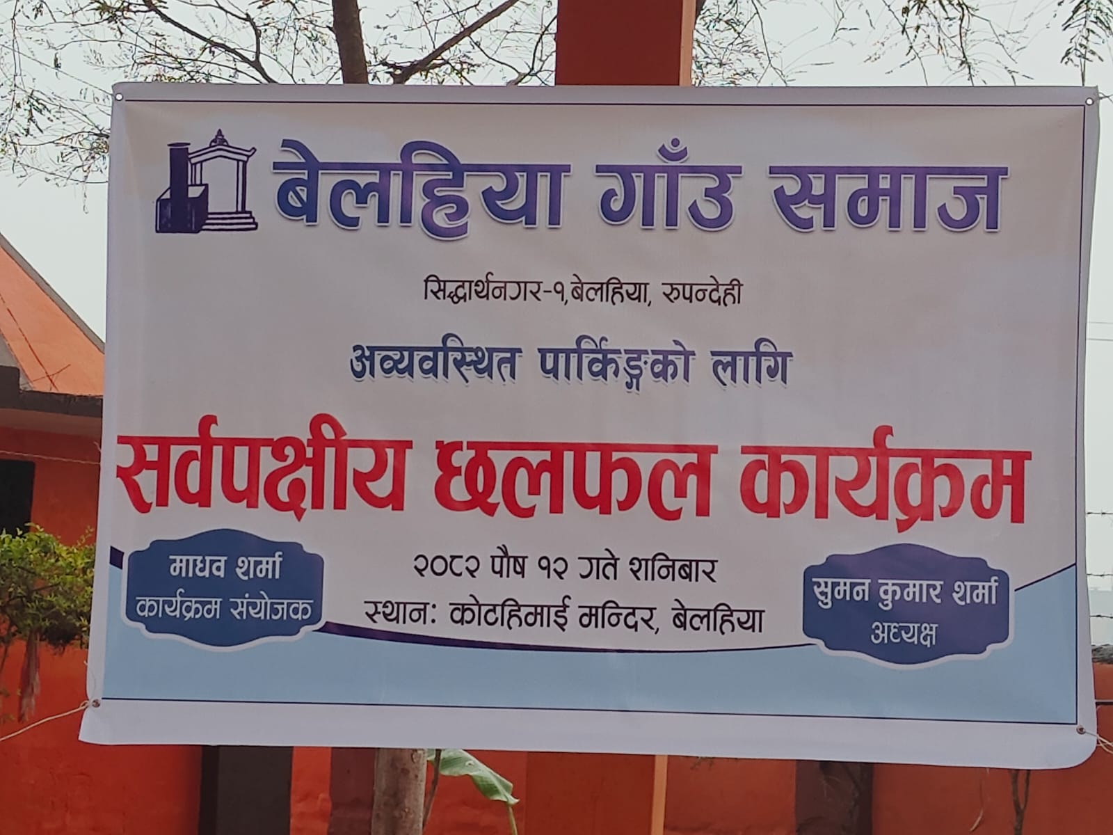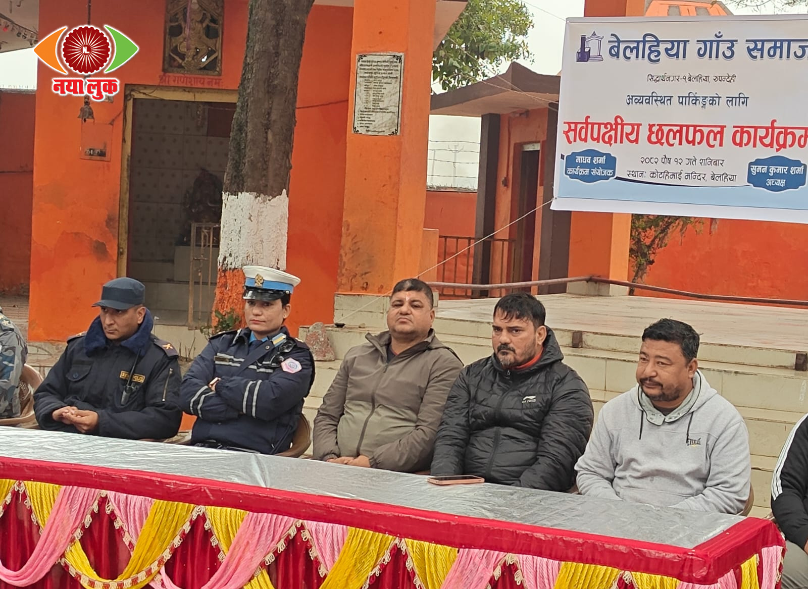 बेलहिया/रुपन्देही। सिद्धार्थनगर-एक बेलहिया में बेलहिया गांव समाज के तत्वावधान में अव्यवस्थित पार्किंग की समस्या को लेकर एक सर्वपक्षीय चर्चा कार्यक्रम का आयोजन किया गया। कार्यक्रम 2082 पौष 12 गते, शनिवार को कोटहिमाई मंदिर परिसर, बेलहिया में संपन्न हुआ, जिसमें समाज के विभिन्न वर्गों के प्रतिनिधियों ने भाग लिया।