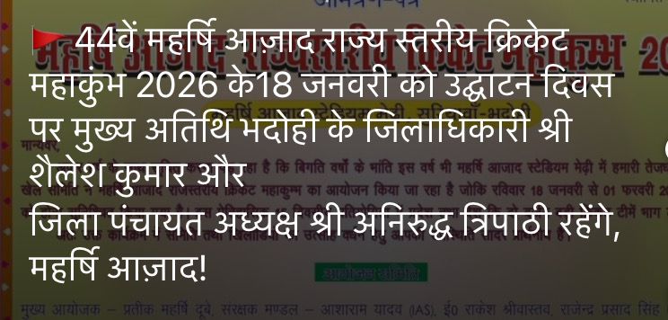 भदोही: करीब 44 बरसों से निरंतर क्रिकेट टूर्नामेंट का आयोजन करने वाला महर्षि आजाद स्टेडियम एक बार फिर बड़े टूर्नामेंट का गवाह बनने जा रहा है। यह टूर्नामेंट 18 जनवरी से शुरू होकर पहली फरवरी तक चलेगा। कुल 15 दिनों तक चलने वाले इस टूर्नामेंट में देश से करीब दो दर्जन टीमें प्रतिभाग करेंगी। प्रतीक महर्षि दूबे की अगुआई में होने जा रहे इस टूर्नामेंट में फिर बड़ी प्रतिभाएं निकलकर सामने आएंगी। बताते चलें कि इस टूर्नामेंट ने टीम इंडिया को दो बड़े खिलाड़ी दिए हैं। यशस्वी जायसवाल और शिवम दूबे इसी महर्षि आजाद राज्य स्तरीय क्रिकेट महाकुम्भ से निकले हैं और आज पूरी दुनिया में अपने कौशल का डंका बजा रहे हैं।