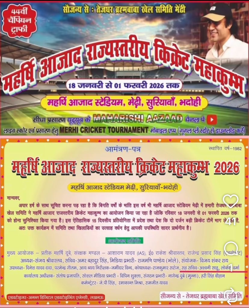भदोही: करीब 44 बरसों से निरंतर क्रिकेट टूर्नामेंट का आयोजन करने वाला महर्षि आजाद स्टेडियम एक बार फिर बड़े टूर्नामेंट का गवाह बनने जा रहा है। यह टूर्नामेंट 18 जनवरी से शुरू होकर पहली फरवरी तक चलेगा। कुल 15 दिनों तक चलने वाले इस टूर्नामेंट में देश से करीब दो दर्जन टीमें प्रतिभाग करेंगी। प्रतीक महर्षि दूबे की अगुआई में होने जा रहे इस टूर्नामेंट में फिर बड़ी प्रतिभाएं निकलकर सामने आएंगी। बताते चलें कि इस टूर्नामेंट ने टीम इंडिया को दो बड़े खिलाड़ी दिए हैं। यशस्वी जायसवाल और शिवम दूबे इसी महर्षि आजाद राज्य स्तरीय क्रिकेट महाकुम्भ से निकले हैं और आज पूरी दुनिया में अपने कौशल का डंका बजा रहे हैं।